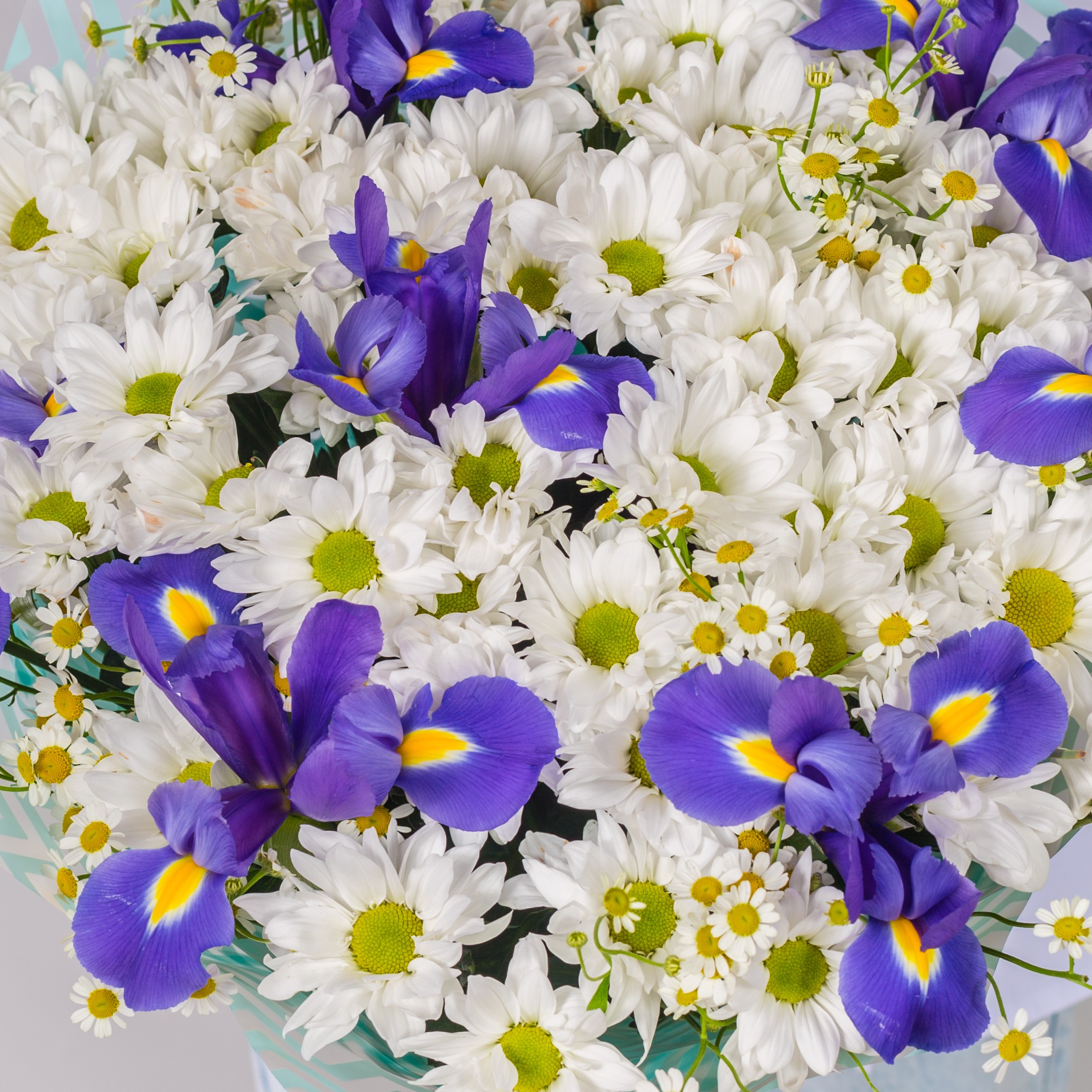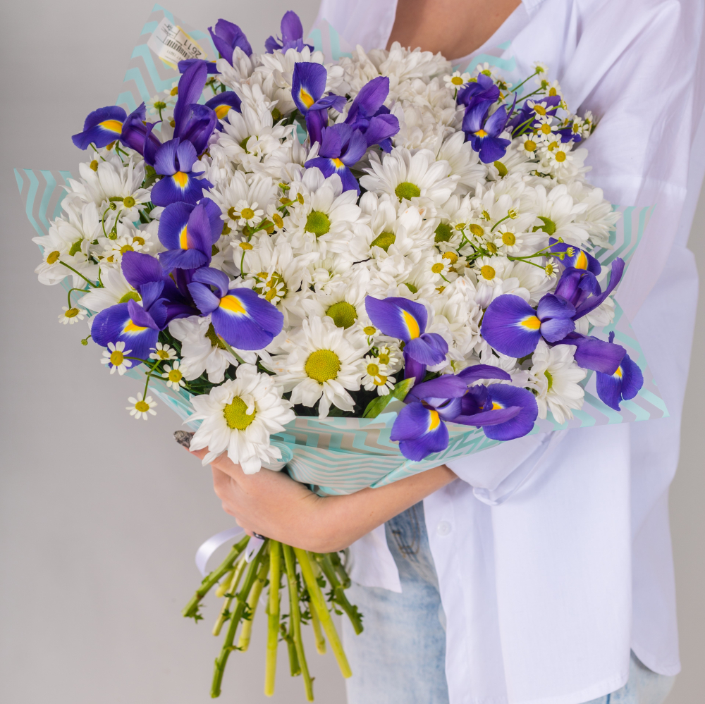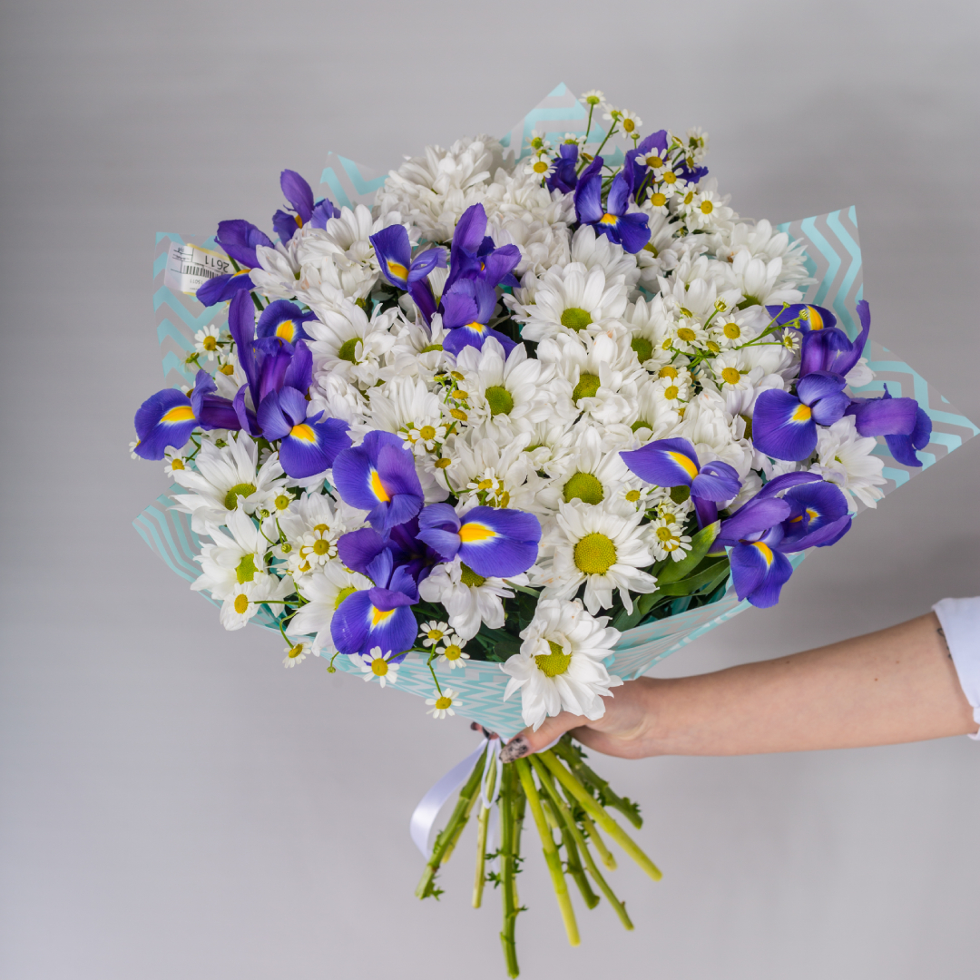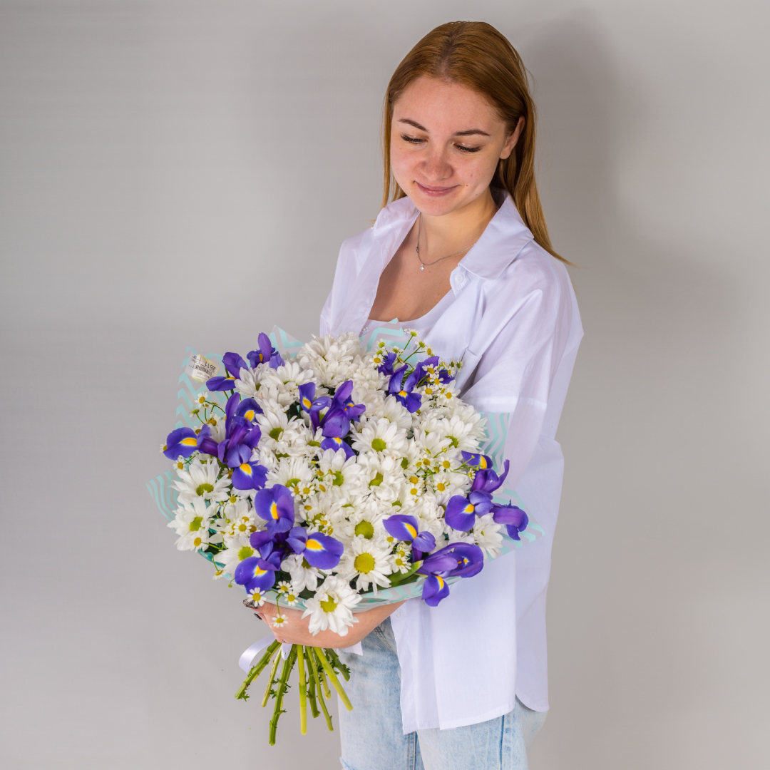 Букет из ромашковой хризантемы: "Соната" с ирисами №7047