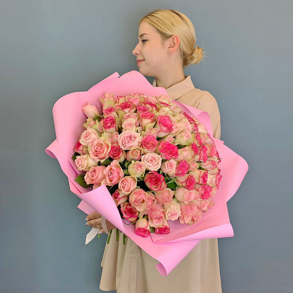 Такой розовый букет дарят маме, любимой, девушке или в знак благодарности, когда хочется удивить красиво и со вкусом. Моноформат выглядит солидно, но остаётся мягким по настроению - это тот случай, когда количество работает на эмоции. Плотная сборка делает букет выразительным, а разные тона роз добавляют глубину и теплоту.