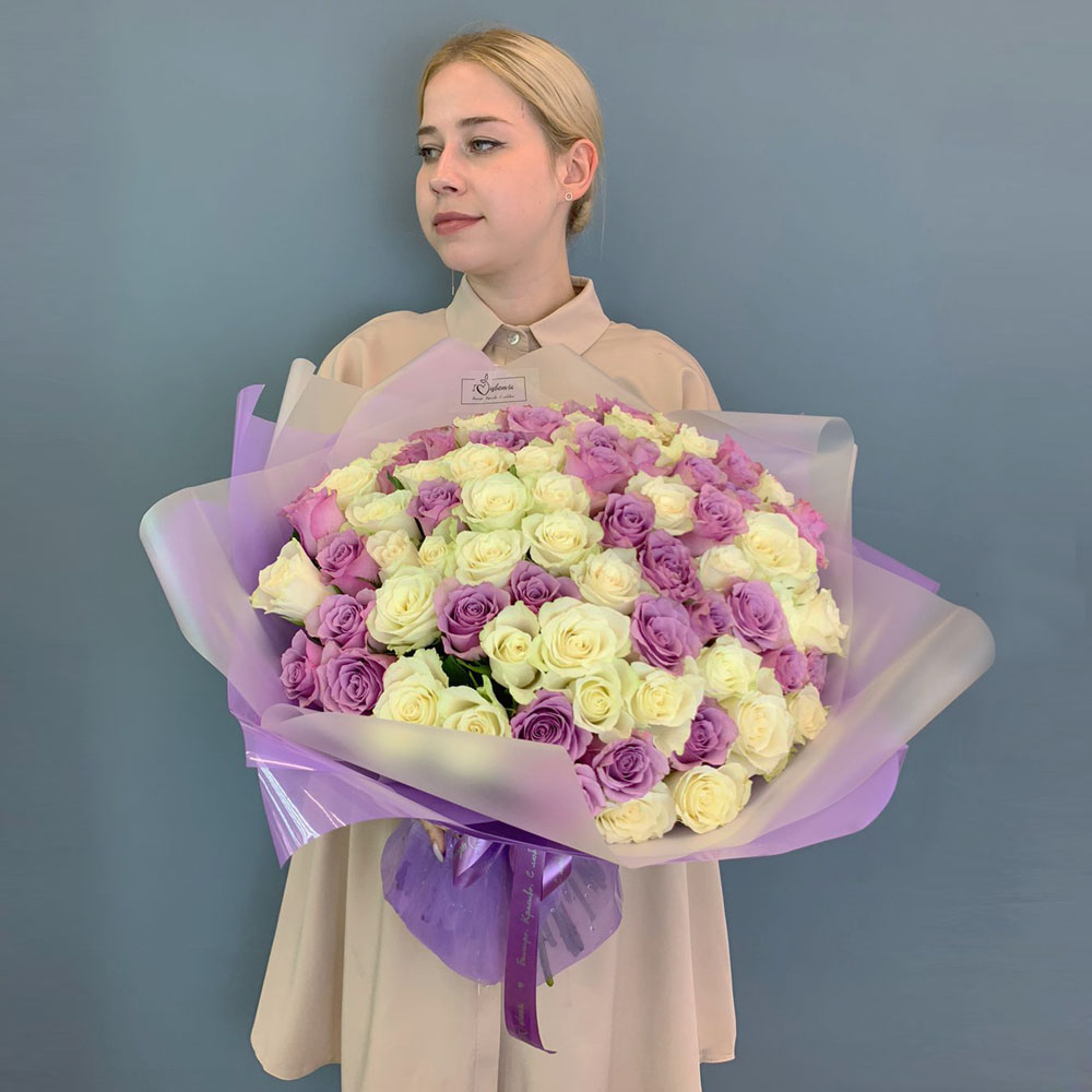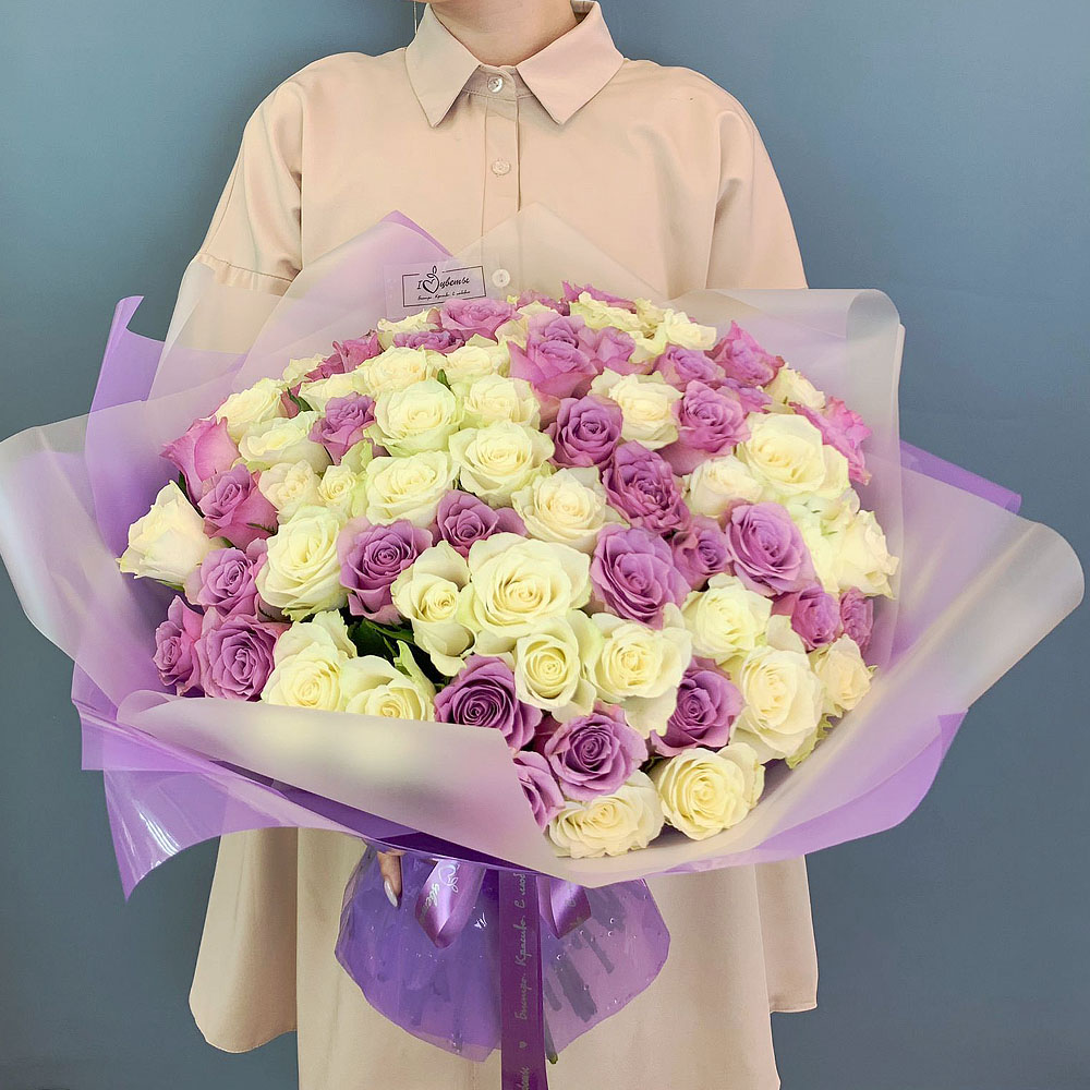 Букет 101 бело-сиреневая роза Кения в упаковке арт. 29178-Р