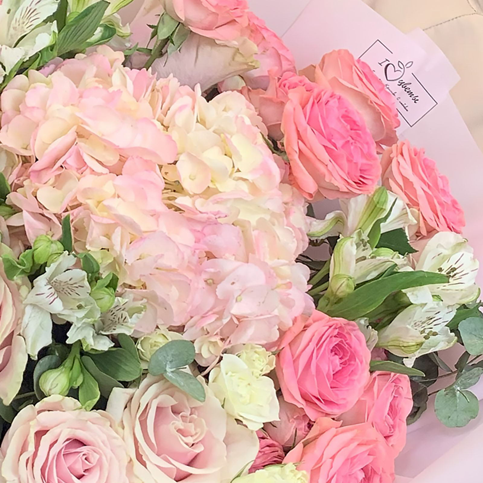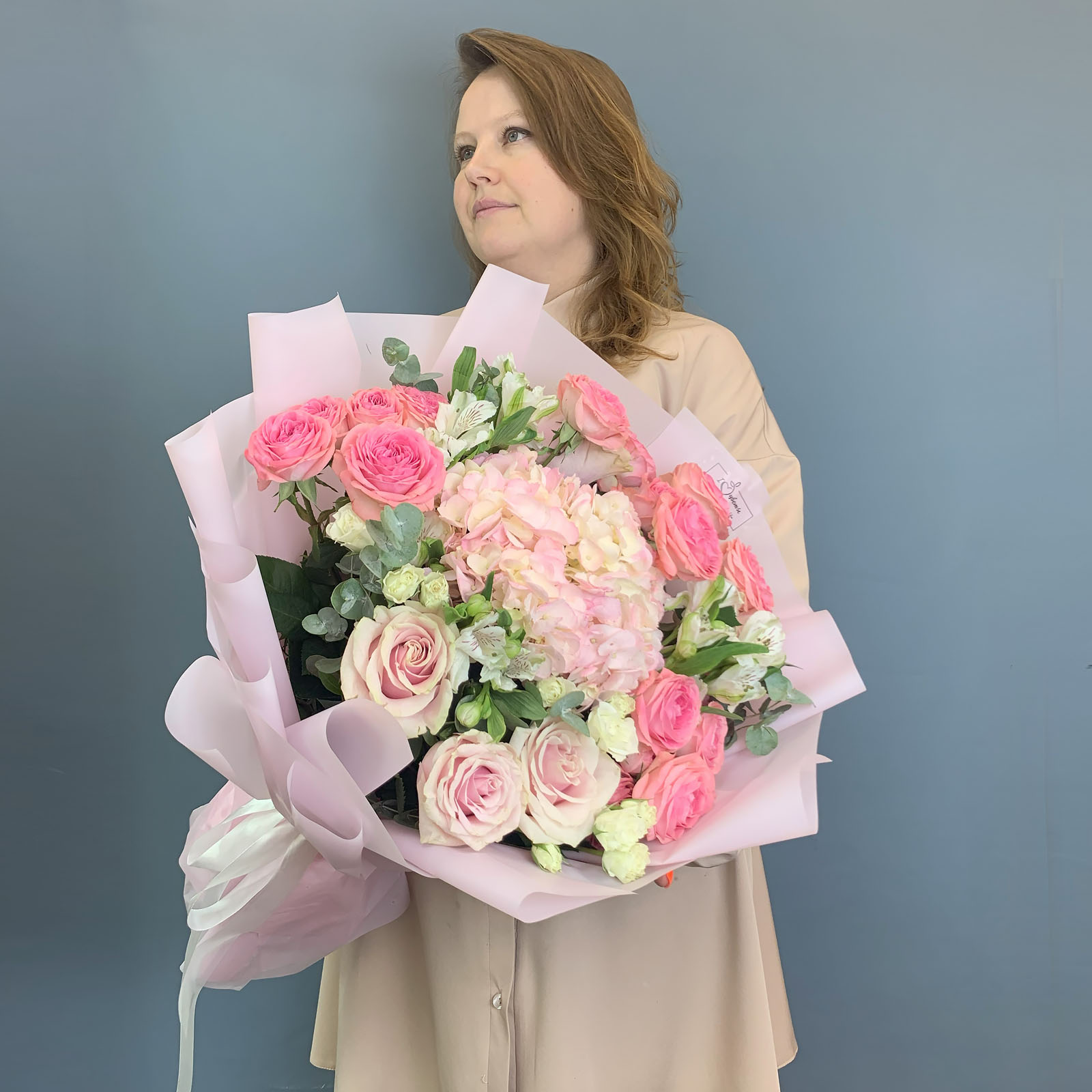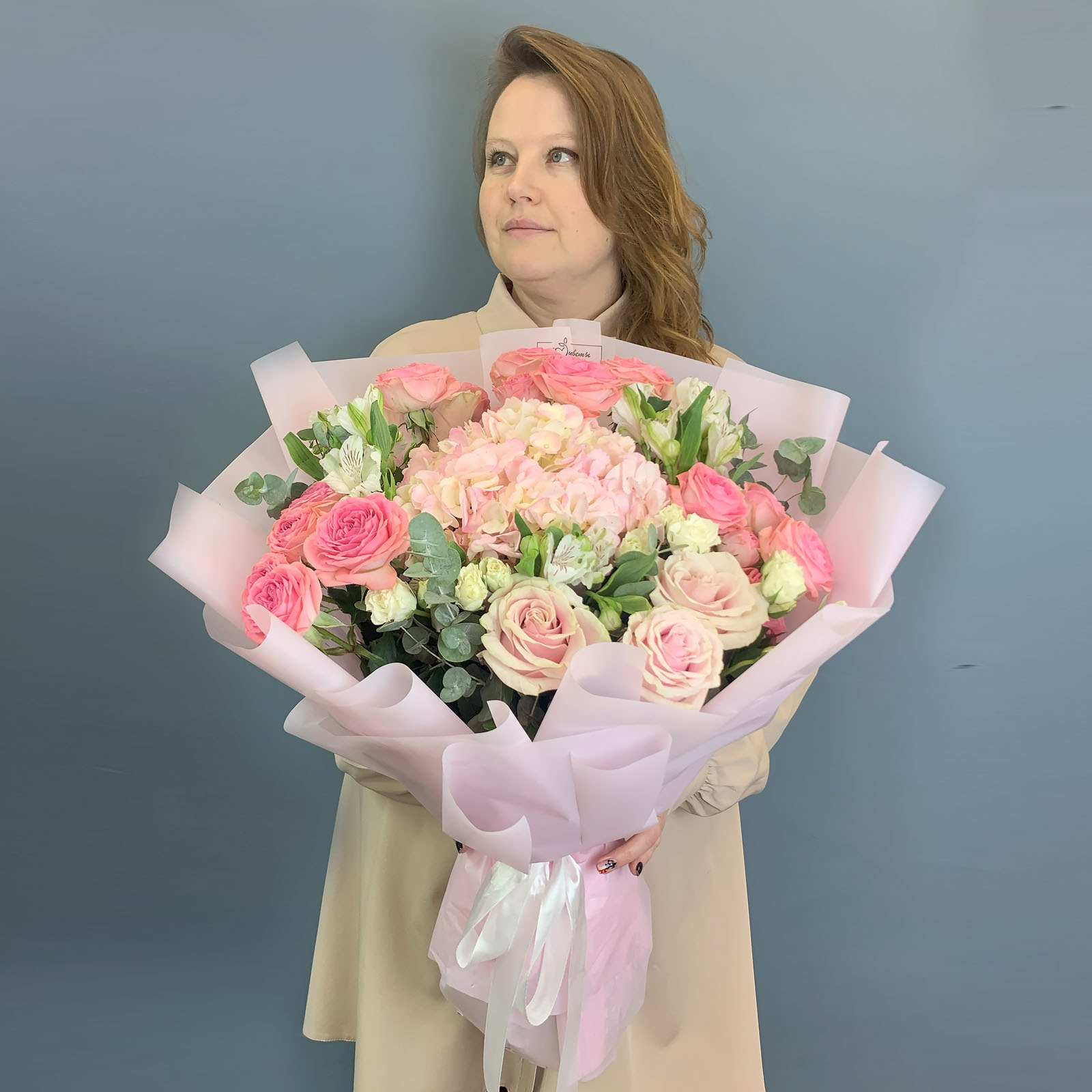 Букет из кустовых пионовидных роз бело-розового цвета арт. 47537