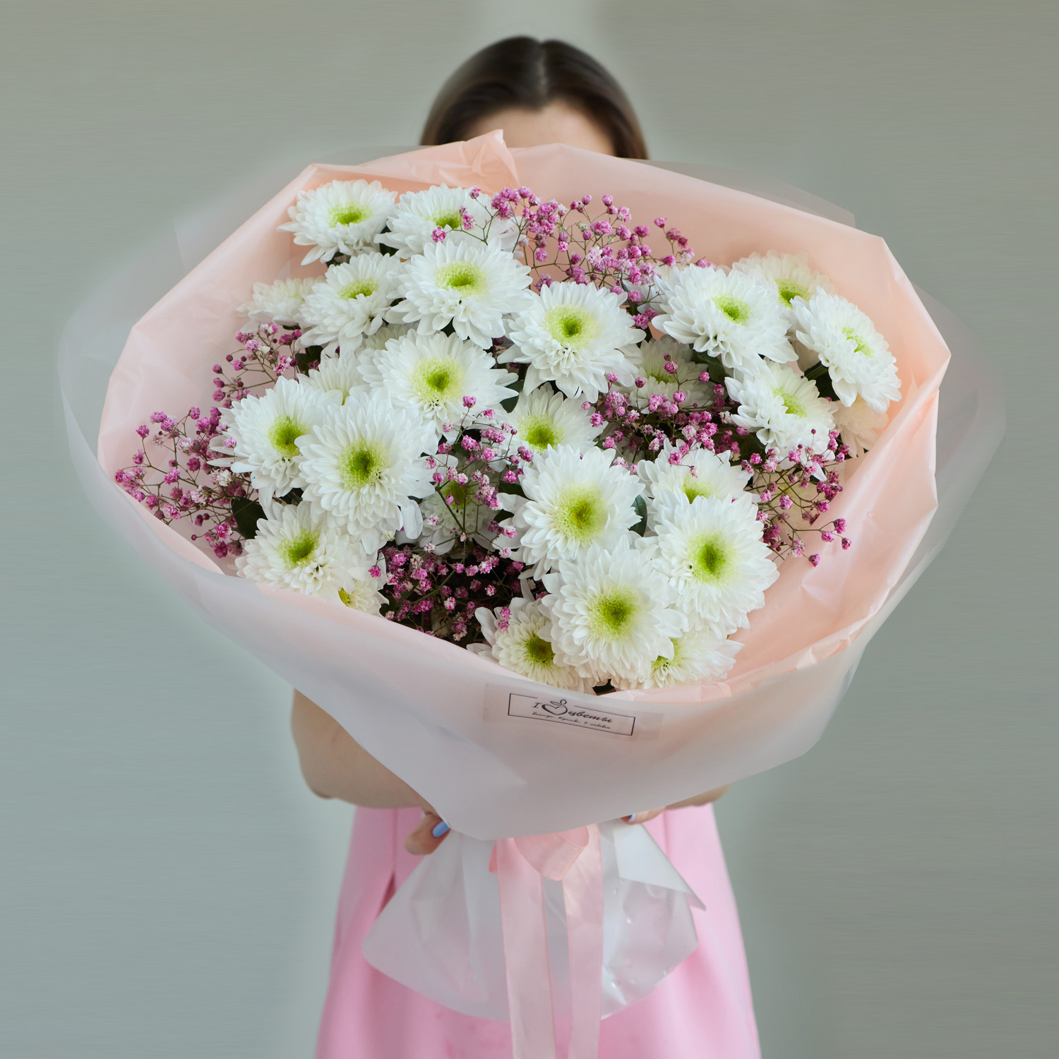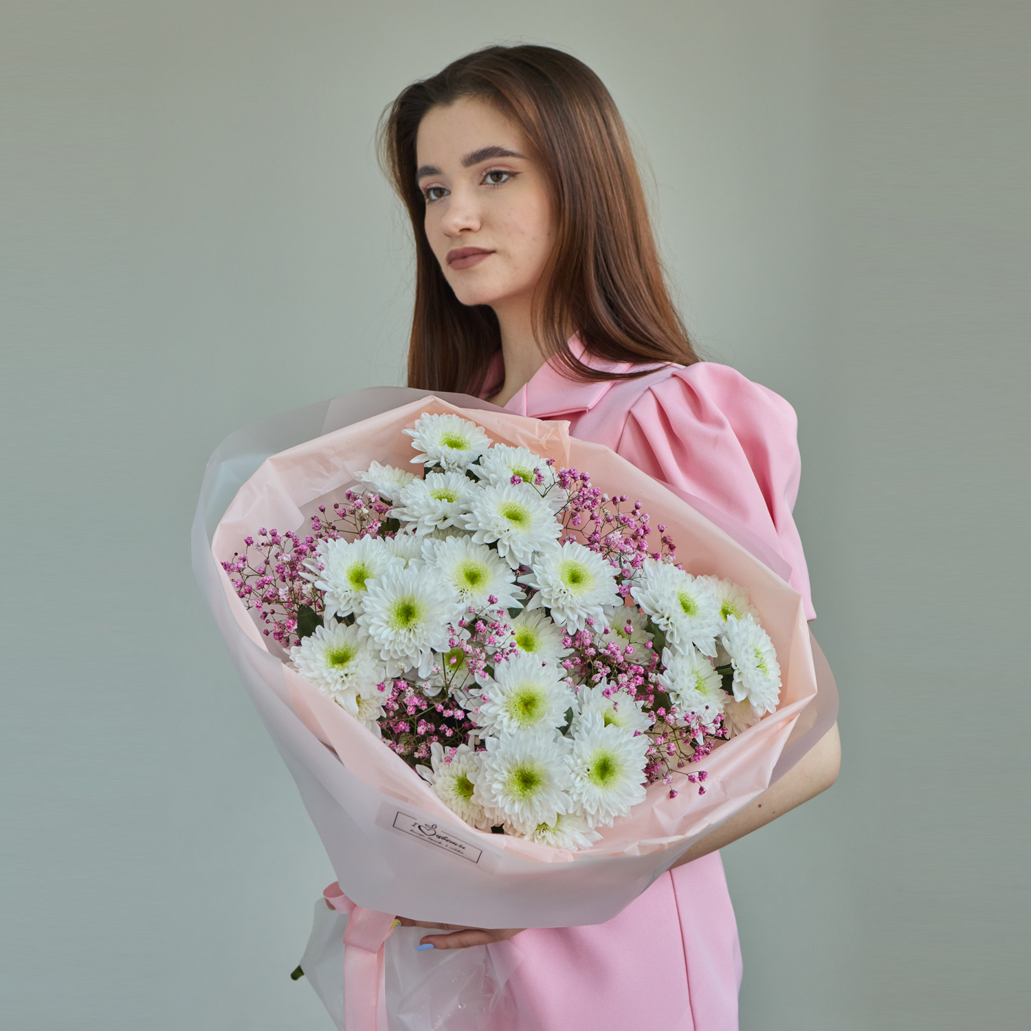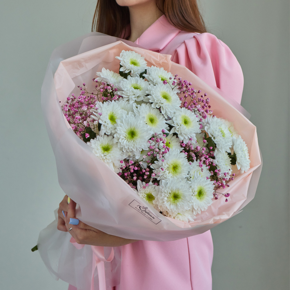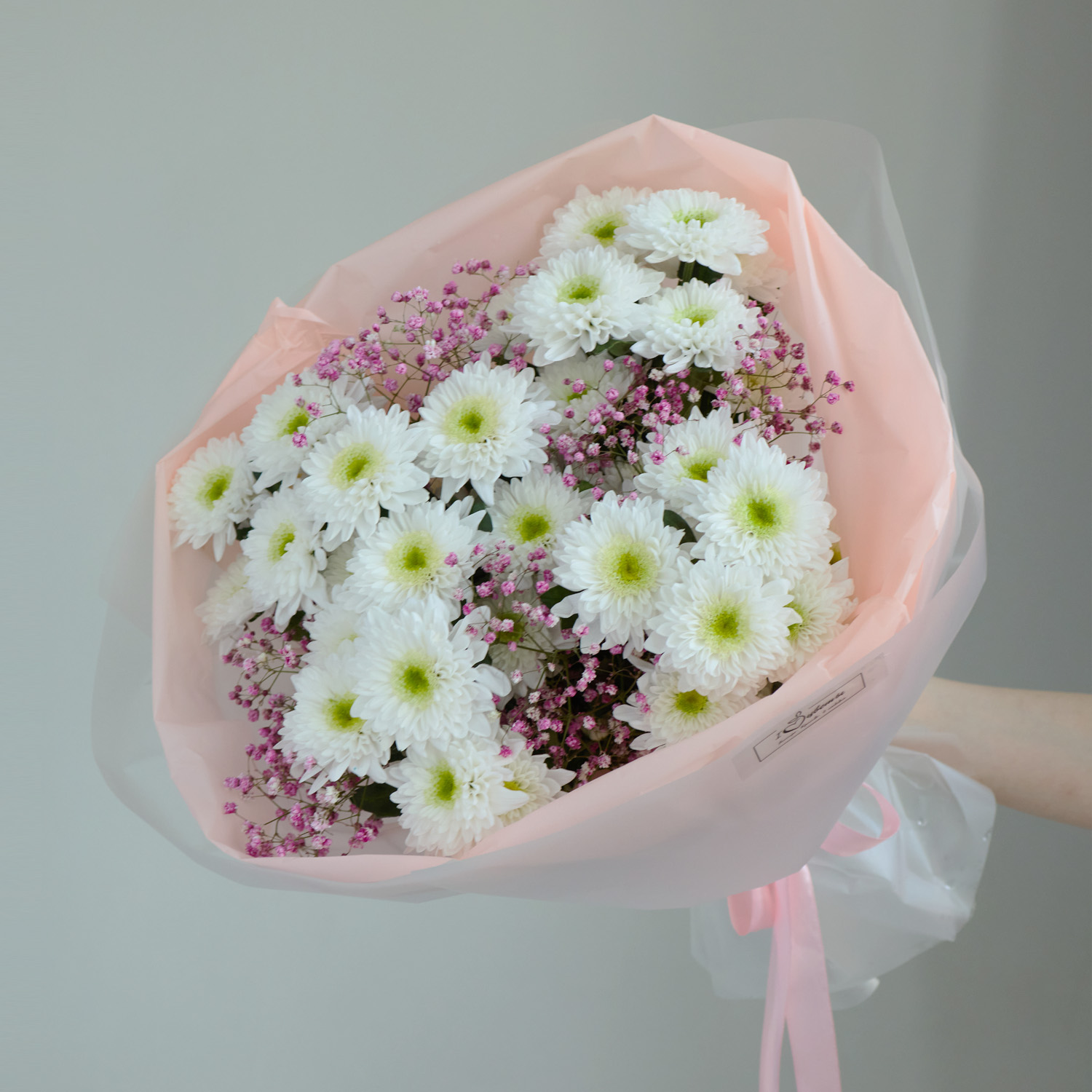 Букет с хризантемой и гипсофилой РОЗОВЫЙ N 84572-Р