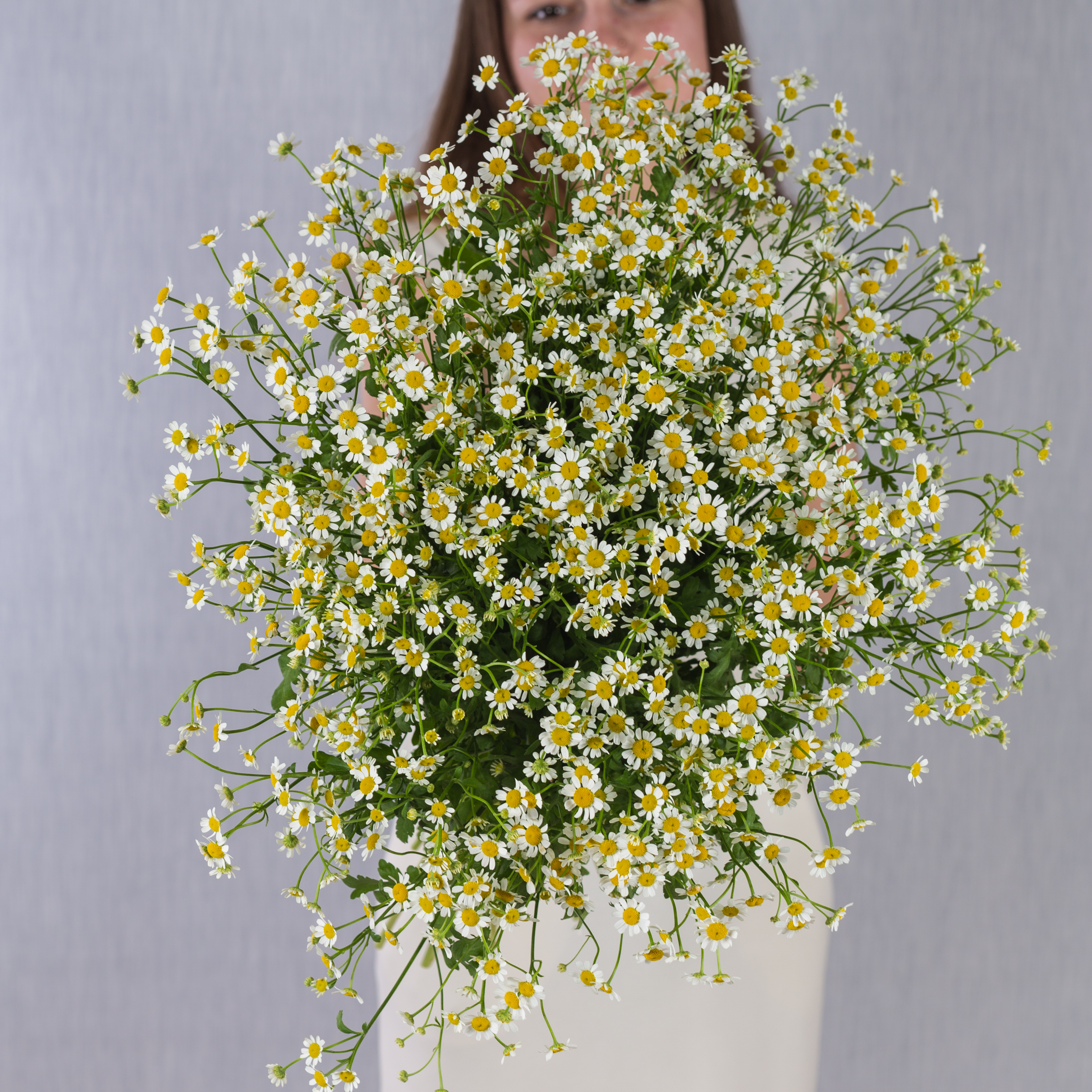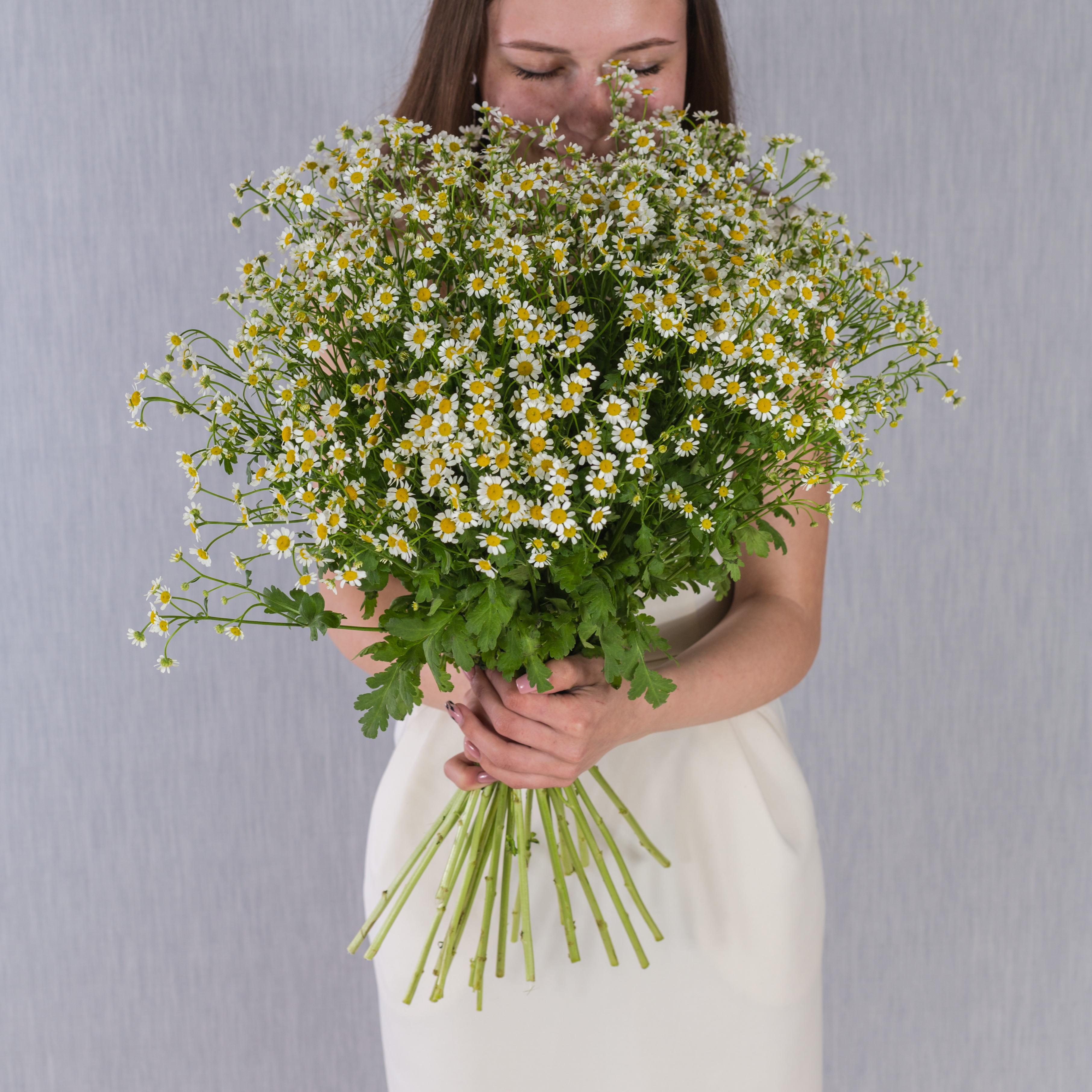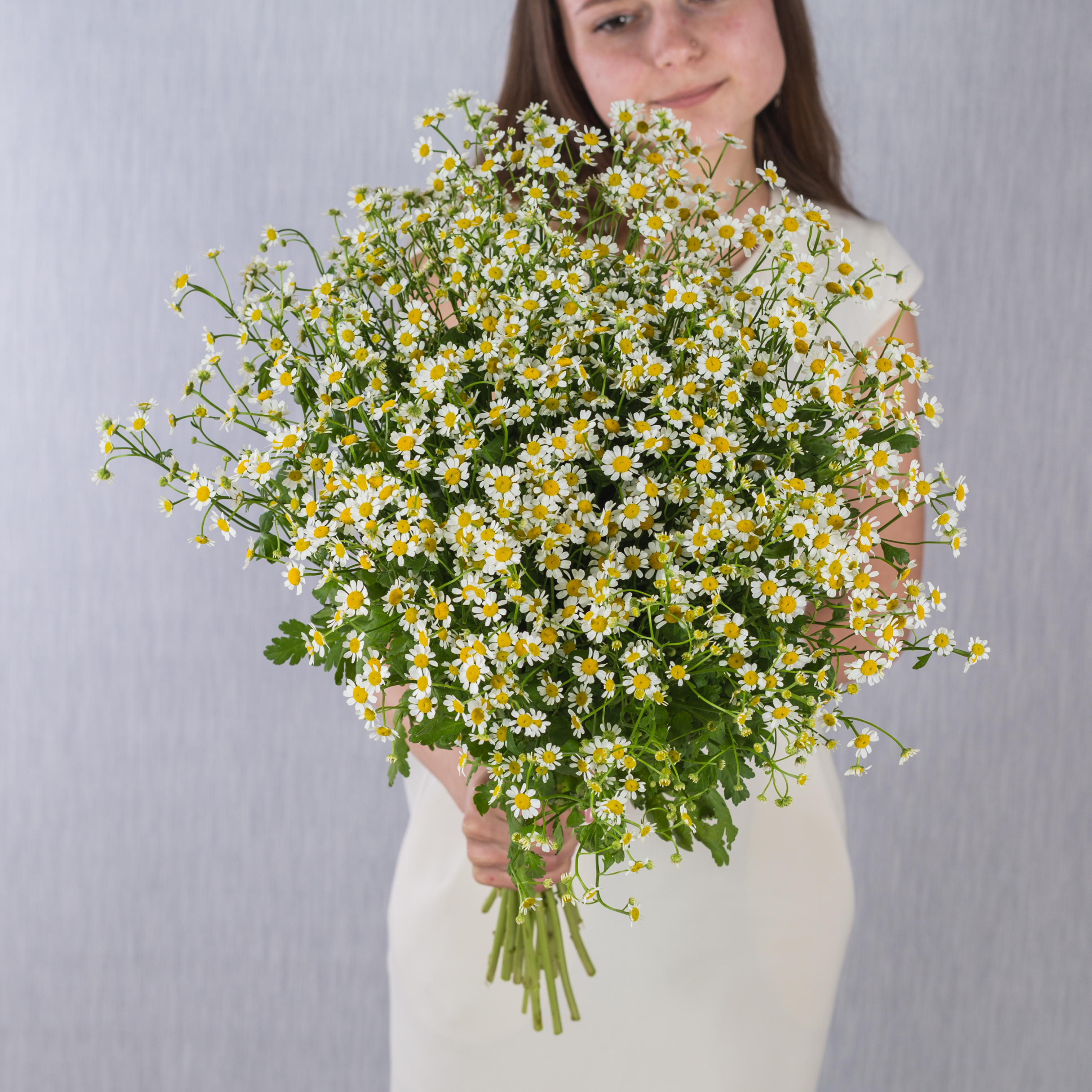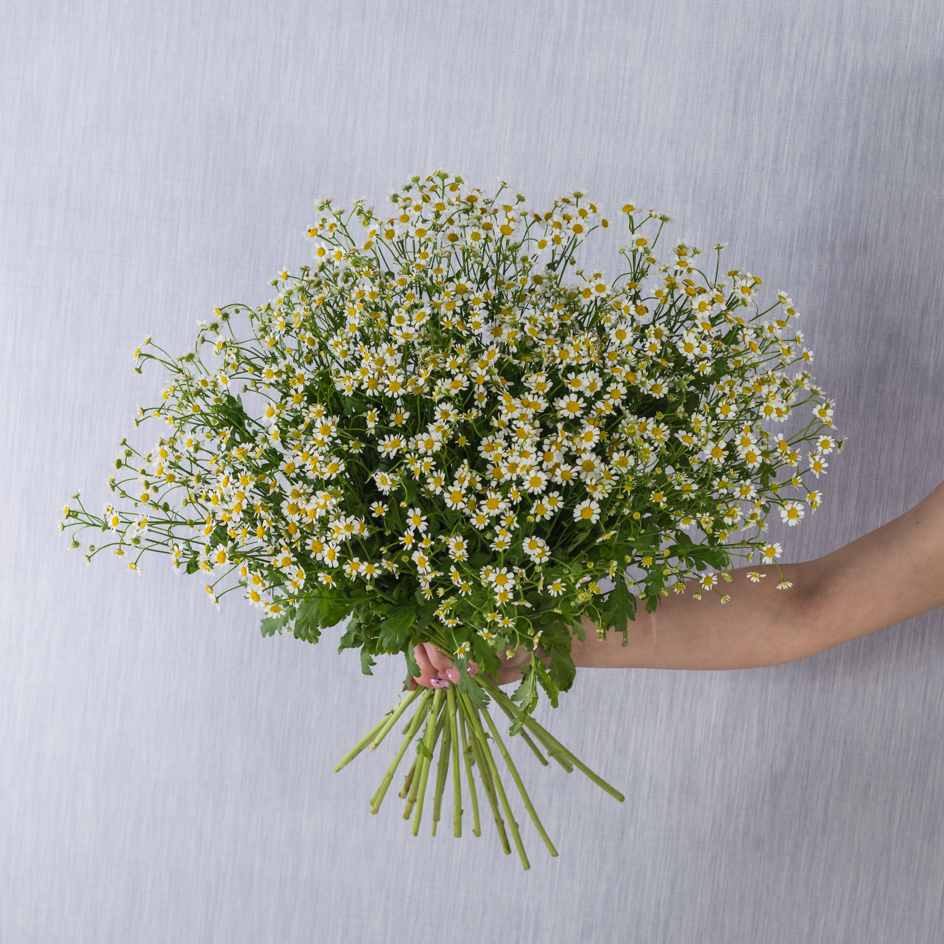 Букет из 25 мелких кустовых ромашек танацетумов с лентой арт. 50582