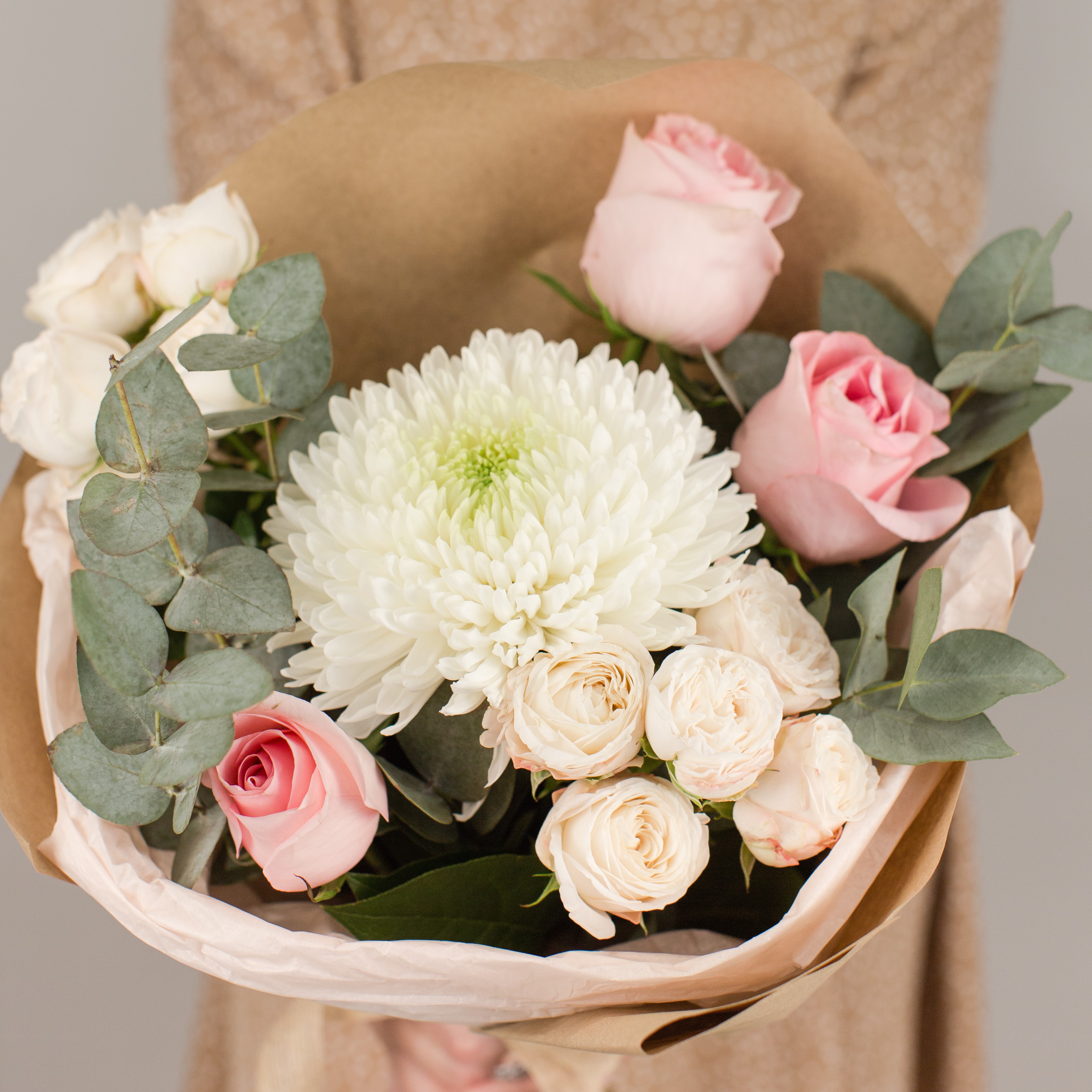 Букет из одноголовой хризантемы с розами и эвкалиптом N 50445